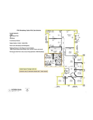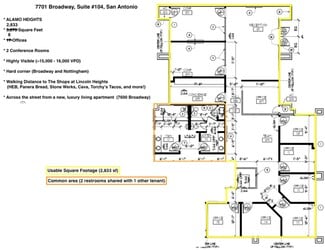 INCENTIVE AVAILABLE - CALL FOR DETAILS. FF&E INCLUDED. Perfectly located at the highly visible corner of Broadway and Nottingham in Alamo Heights, this property offers an easy walk to Lincoln Heights (HEB, Panera Bread, Stone Werks, Sushi Zushi, Cava, Torchy's Tacos) and is directly across the street from the brand new (opened 2023) luxury living apartment complex, 7600 Broadway (www.7600broadway.com).