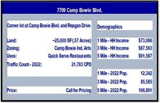 • 325 feet of Frontage on Camp Bowie West and 212 feet of Frontage on Reagan Drive