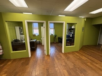 office layout with a kitchenette, two private offices, a tastefully finished restroom, and a rear storage room—making it ideal for