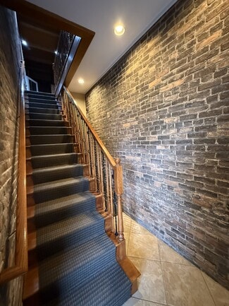 The second floor, accessed through a shared common entrance, is highlighted by a stunning exposed brick stairwell and custom