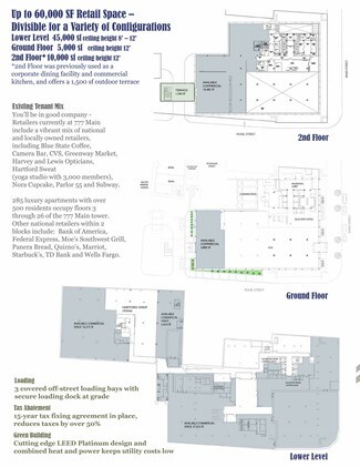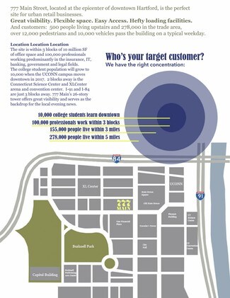 500 to 40,000 Square Feet Available with 12' ceiling heights - Divisible for a Variety of Configurations 777 Main, located at the epicenter of downtown Hartford, is the perfect site for urban businesses. Great visibility. Flexible space. Easy Access. Hefty loading facilities. Electric car chargers. And customers: 500 people living upstairs and 278,000 in the trade area, over 12,000 pedestrians and 10,000 vehicles pass the building on a typical weekday. You’ll be in good company - Retailers include a vibrant mix: CVS, Blue State Coffee, Camera Bar, Greenway Market, Harvey and Lewis Opticians, Hartford Sweat (yoga studio with 3,000 members), Dhaba Wala Indian Kitchen, and Subway. LEED Platinum Green Building; 3 covered off-street loading bays with secure loading dock at grade. Barber Shop / Beauty Salon and Pet Shop spaces recently became available.
