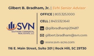Contact SVN | Southern Commercial Real Estate Senior Advisor Gilbert Bradham directly at (843) 532-1641 and connect on LinkedIn at: https://www.linkedin.com/in/gilbradhamjr29487/