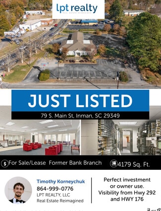 Located in the heart of downtown Inman, this former bank branch at 79 S. Main Street offers a compelling opportunity for investors or owner-users seeking a highly visible, versatile commercial asset. Positioned prominently along the intersection of Hwy 292 and Hwy 176, the property benefits from steady traffic flows, excellent exposure, and convenient access for both local residents and regional commuters. Its central Main Street location places it within Inman’s growing commercial corridor, creating strong potential for retail, office, financial, professional services, or adaptive reuse concepts. The building features a prominent façade that naturally draws attention from passing vehicles, making it well-suited for businesses seeking meaningful roadside identity in a walkable, established downtown setting. The structure’s former use as a bank provides functional advantages such as a professional layout, durable construction, and adaptable interior space that can be reconfigured to support a variety of modern uses. The site’s visibility and frontage offer strong brand placement opportunities, while the surrounding area continues to experience local economic activity and revitalization. With its strategic corner location, recognizable architecture, and flexible potential, this property delivers an excellent opportunity for a wide range of commercial users. Whether positioned as an investment acquisition or transformed for an owner-occupant, it represents a rare chance to secure a Main Street presence in one of Spartanburg County’s steadily growing communities