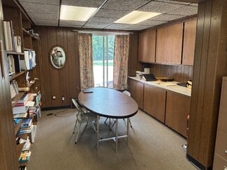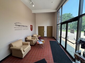 • Seats 260–280 and features a choir loft, fellowship hall, kitchen, nursery, two classrooms, three offices, a library/conference room, and sacristy