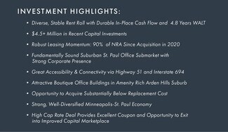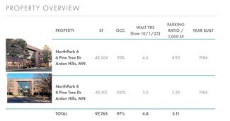 CBRE is pleased to present qualified investors with the opportunity to acquire NorthPark 6 & 8 located in the sought after Minneapolis suburb of Arden Hills, MN. The well-located, 97,765 square foot campus consists of two boutique office assets that are currently 97% occupied. NorthPark 6 & 8 has completed 87,930 square feet of new and renewal leasing activity since August 2020 resulting in an impressive 4.8 years weighted average remaining lease term. This opportunity offers investors a durable in-place cash flow coupled with the ability to significantly increase NOI through the lease-up of existing vacancy, mark-to-market rent increase, and capitalizing on a strong corporate presence.