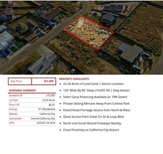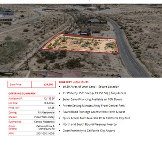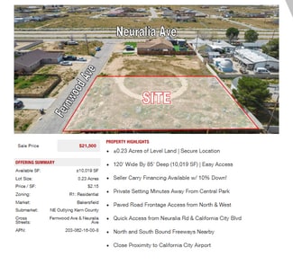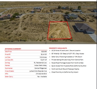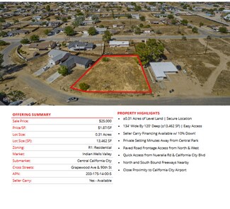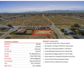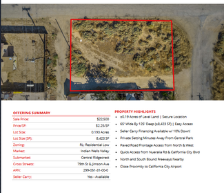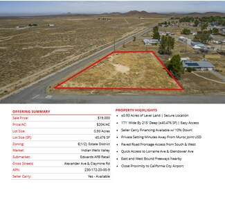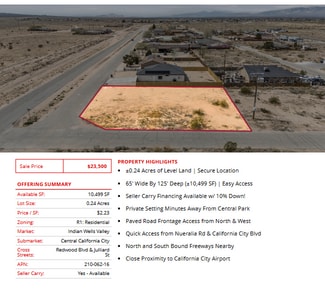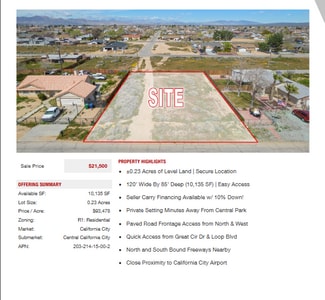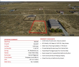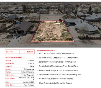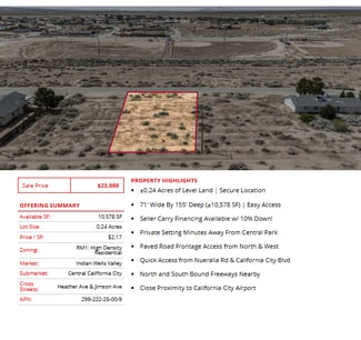 Prime semi-custom SFR development land totaling ±4.04 Acres (±176,150 SF) located in California City (12 lots), Edwards (1 lot), and Ridgecrest (1 lot). The parcels are centrally located in each city, leading to easy access into all major retail hubs and highways to Los Angeles, Fresno, Bakersfield, and the coast. Existing paved roadways leading to the properties from neighboring developments are in place and the land is a blank and clean canvas for flexible concepts. Land parcels are near Interstate 5, highways 299, 89, and 99 providing easy access to Tulare, Kings, Fresno, Los Angeles county & many others! SFR development is consistent with the land use (adjacent parcel & across the street), is within the holding capacity, conforms to all policies, avoids traffic congestion, and is ready for flexible concepts.