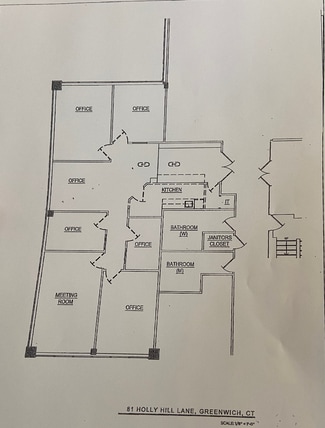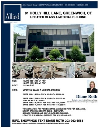 81 HOLLY LANE, GREENWICH, CT UPDATED CLASS A MEDICAL BUILDING SUITE 203 ENTIRE SPACE IS 2,798 +/- RSF X $52 RSF = $12,125.00 MONTH. OR CAN BE SUB DIVIDED SUITE #203 A - 1,400 +/- RSF X $52 RSF = $6,066.66 SUITE #203 B - 1,400 +/- RSF X $52 RSF = $6,066.66 SUITE #200 - 1,400 +/- RSF X $52 RSF = $6,066.66 TENANT PAYS $3 RSF FOR ELECTRIC. LANDLORD PAYS FOR CLEANING. NEWER SPACE IN MODERN BLDG ELEVATOR BLDG. GARAGE PARKING AND AMPLE OUTDOOR PARKING. LOCATED IN A MEDICAL DISTRICT OFF W. PUTNAM AVE. **INFO, SHOWINGS TEXT DIANE ROTH 203-962-6558** Listed subject to errors, omissions change of price and withdrawal without notice.