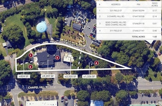 Rare opportunity to acquire four contiguous parcels totaling approximately 1.60 acres in the heart of Cary’s Walkable Center development framework. Zoned TC (Town Center), the site offers exceptional flexibility for mixed-use, multifamily, retail, or commercial development. With premium frontage along Chapel Hill Road and Field Street, this assemblage is ideally positioned for a signature urban infill project.