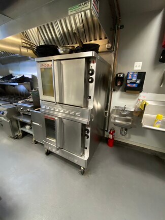 Fully equipped kitchen with a $25,000 wood-burning pizza oven, 14ft exhaust hood w/heated air return, 10-burner stove w/oven, 2ft char grill, fryer, double stack