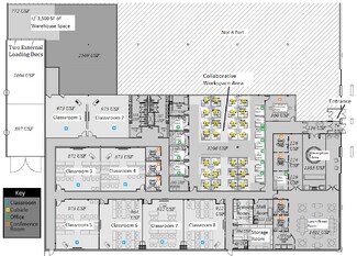 • Flexible suite layout with 8 classrooms, collaborative workspace area, multiple conference rooms/private offices, lunch room