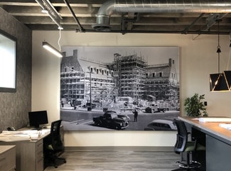 This Roosevelt Era historic structure has been converted into a modern first class multi-tenanted office facility.    The main entrance to the building is the entranceway into the historically significant rotunda, which illustrates the history of the printing press and the First Amendment.  This artwork was commissioned by President Franklin D. Roosevelt through the Works Progress Administration (WPA) in 1942.