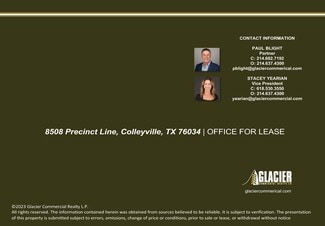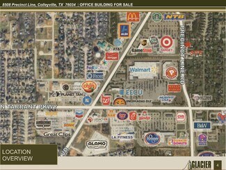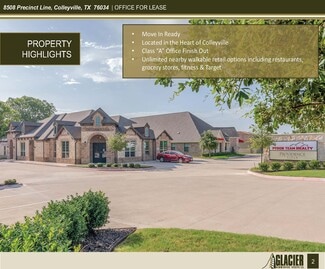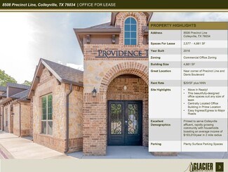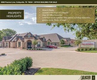 Situated in the heart of Colleyville with excellent proximity to Hurst, North Richland Hills, Keller, and Southlake, 8508 Precinct Line Rd offers a well-maintained ±4,661 SF office building available for sale or lease. The property features attractive brick and stone architecture, professional interior finishes, and a functional layout suited for a wide range of office users. With ample parking, monument signage, and strong surrounding retail—including Walmart, Kroger, and numerous dining options—the site provides both visibility and convenience for employees and clients.