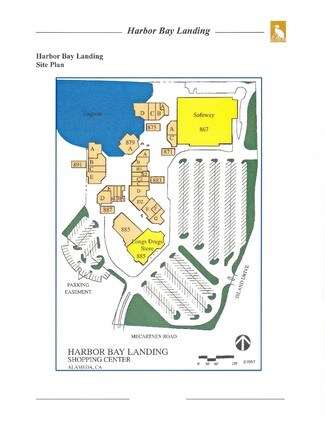 The Harbor Bay Landing Center, located at the intersection of Island Drive and Mecartney Road, is anchored by a Safeway. The center services an upscale clientele living in the Harbor Bay Isle residential development and Bay Farm homes. On-site amenities include a food court and children's play area. The center is located right on the beautiful Harbor Bay Isle Lagoon which has walking and biking paths throughout the local neighborhood. The Oakland International Airport is minutes away as is downtown Oakland and San Francisco. A direct link over the SF Bay to San Francisco is provided by ferry service operated by Golden Gate Water Taxis (GGWT).
