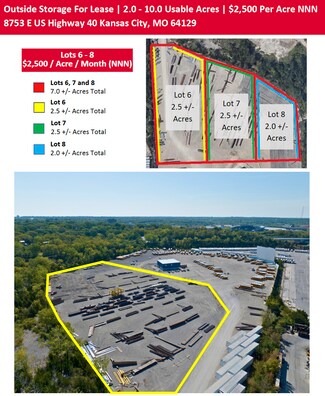Up to 10 Acres Currently Available Multiple Lot Sizes & Configurations Available Owner Willing to Split, Fence & Light Separate Lots with Acceptable Deal Terms Compact Rock Surface Ideal for Trailer Parking or Equipment Storage Excellent KC Location & Access to I-435 & I-70 Zoning: Misc. Retail Trade