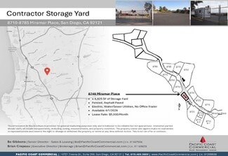 PROPERTY FEATURES • Outstanding Western Miramar Location with Easy Access to I-805, I-15 and I-5 • Great for Contractors, Fleet Parking, Material Storage, Slab Storage and More • Outside Storage & Vehicle Parking • Fully Fenced