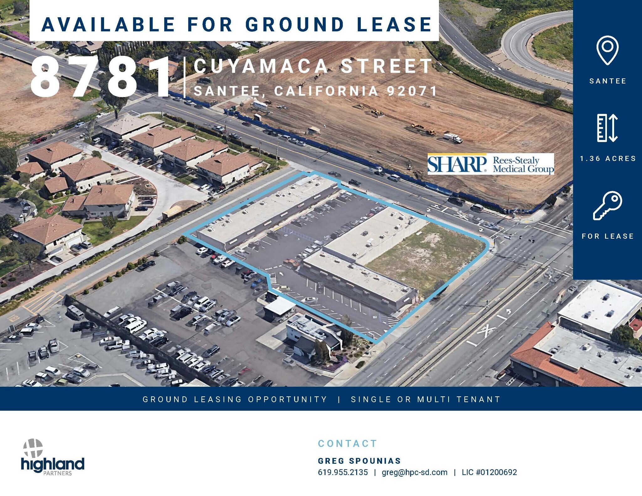 Highland partners corporation is proud to present a unique leasing opportunity located at the NEC of Cuyamaca St & Buena Vista Ave in the city of Santee, CA. This 59,555 sf site is made up of three parcels including the hard corner. This site has never had the benefit of the hard corner being included in a project.
