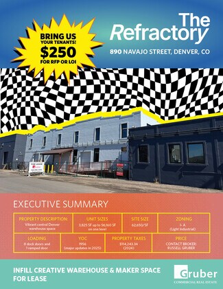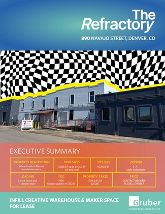 Welcome to the Refractory Central Denver Industrial Warehouse Space. This property is a infill multi-Tenant industrial property focused on community within the property. The building which is rich in Denver history was Initially a pickle production facility has since seen additions and major power upgrades. The building beyond its extremely central location also offers all new LED lighting, NEW HVAC, a fully updated building and versatile loading. The building offers spaces for lease ranging from 3,899/SF all the way up to 56,160/SF. The available spaces all have different attributes from the spaces character to clear heights and natural light opportunities. If you are looking for vibrant central warehouse space then 890 Navajo is a must see! Space sizing details are listed below.