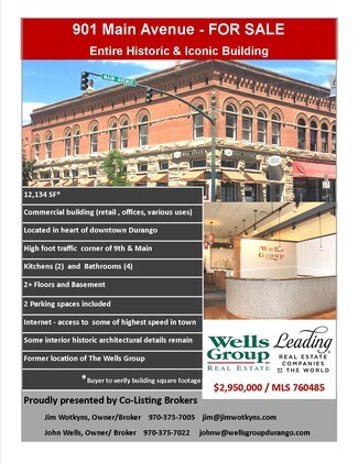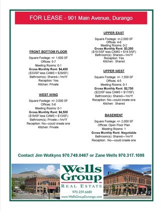 Original First National Bank Historical Building in Downtown Durango for LEASE! This particular ground level floor space has its exclusive entrance off 9th street with approximately 3,000SF currently configured with one meeting room, five large offices, two restrooms and a kitchenette. You could easily use the offices as shared rooms (current use) or as private offices. This is one of the best office space deals in all the Downtown area for the price and location. Lease rate is all inclusive: NOTAXES, NO INSURANCE, NO CAM DUES and NO UTILITIES. This is $18 gross which is $13 NNN and $12/SF below block average, huge value! NOTE: check out the other two listings within 901 Main Avenue. A lessee can lease all, one or multiple spaces if needed. **ENTIRE BUILDING IS FOR SALE, TOO**