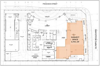 5,797± indoor retail, restaurant, or office area plus bonus 1,182± SF exclusive outdoor seating area. Ceiling heights: slab to slab 20'-6" | Clear 16'-6" | Kitchen 12'-0". Width: 10'-6". Valet parking for customers. CUP approval. On-site alcohol sales: 10 AM to 2 AM | 7 Days a Week. Restaurant seat count: 331. Power: 600 amps/480-277 volts. HVAC: Chilled water fan coil | 30.7 tons total load for kitchen | 36.4 tons total load for restaurant retail or office area. Directly across from LA LIVE. Call broker for lease rate. Rent is based on 5,797 SF interior area. Bonus offer: Half rent for first 3 months ($1.75 per SF)!