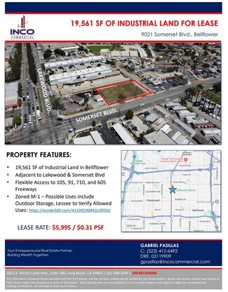 19,561 Square Feet of Industrial Land in Bellflower. Previously developed lot. Zoned M-1. Contact Gabriel Pasillas for more info (323) 412-6492
