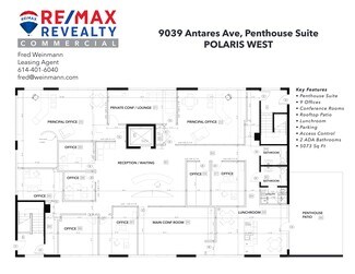 A synopsis for an exceptional penthouse office suite located at 9039 Antares Ave, Columbus, Ohio, in the highly desirable Polaris area adjacent to Chase Bank headquarters with 12,000 employees. Anticipating strong market interest, this offering presents a unique opportunity for discerning clients seeking premium, well-appointed commercial space.