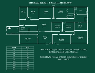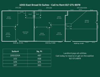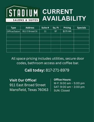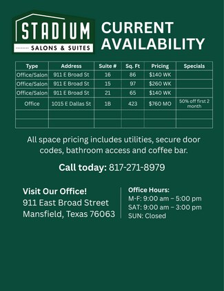 Welcome to 911–1003 E Broad St, micro office and salon suites! These are private, budget friendly office suites that are all bills paid. Each unit includes high speed wifi, electricity, water and a private mailbox all rolled into one transparent monthly or weekly rate. These spaces are highly visible and conveniently located just minutes from major roadways, restaurants, and retail. They’re ideal for beauty care professionals, small business owners, contractors, entrepreneurs, and anyone needing flexible space without the hassle of long-term leases. Our newly updated office suites are designed for comfort and functionality - featuring smart lock access, 24/7 video surveillance, and an on-site coffee bar to enjoy a professional setting that supports your productivity. Need storage, too? We offer affordable self-storage units on-site, perfect for inventory, tools, files, or equipment. Take advantage of bundled rates when you lease both an office and storage space!