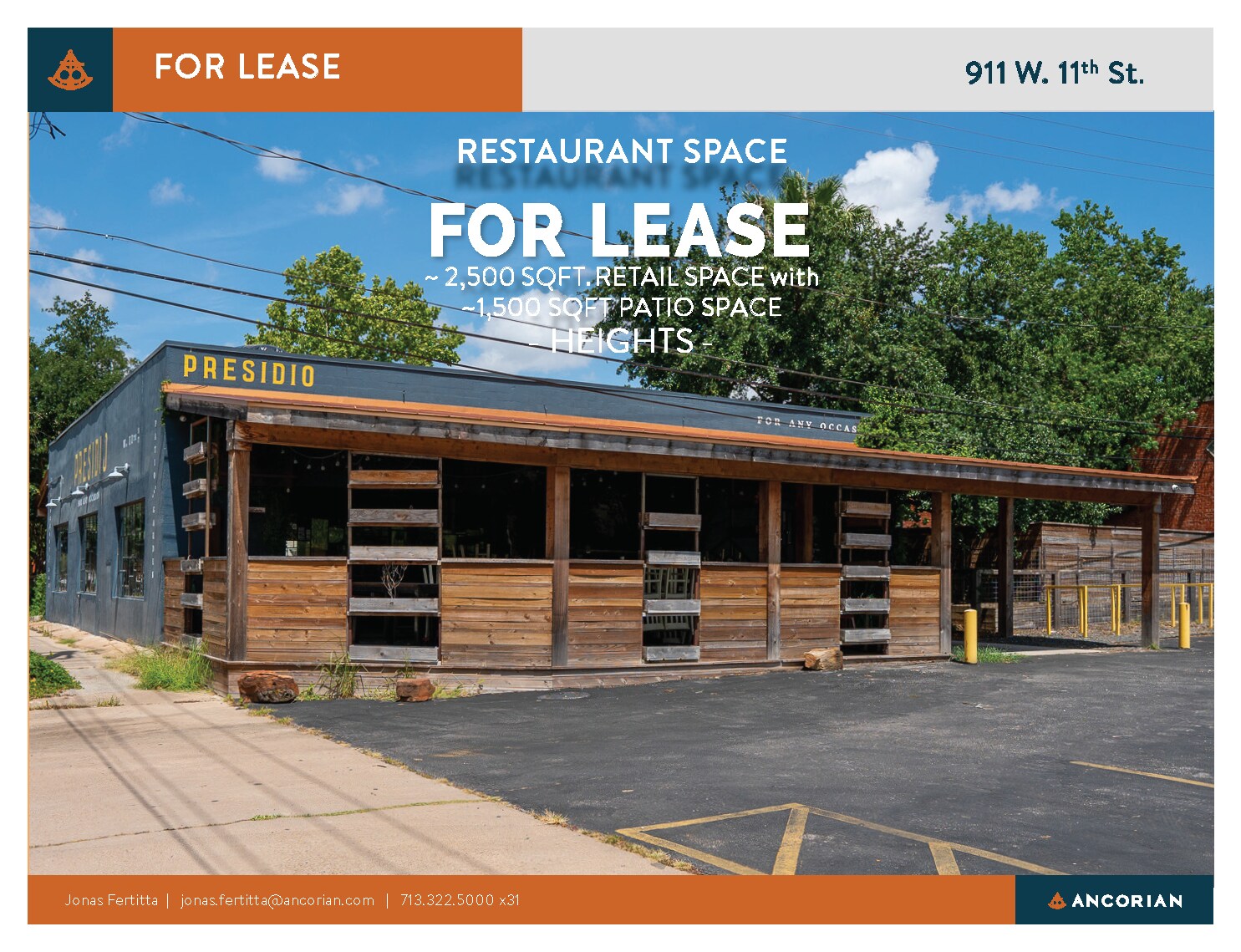 Second generation restaurant space in the heart of Houston Heights! 2,500 SF building with 1,500 SF of patio space available.