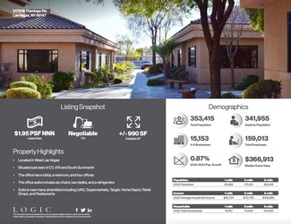 +/- 990 SF Office Condo for lease in the Flamingo Trails Professional Plaza located in West Las Vegas. The plaza is located off of W. Flamingo Rd, near S. Fort Apache Rd. with easy access to the CC-215. The office has a lobby, restroom and four (4) offices and includes two (2) desks, six (6) chairs and a refrigerator. Great location as it is located near Summerlin South and is near many amenities including Las Vegas Athletic Club, Supermarkets, Target, Home Depot, Retail Shops and Restaurants.