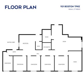 The property is a medical office building located on US-44 in Bolton, Connecticut. It offers on-site parking and is accessible from regional highways. Interior layout includes multiple exam rooms, a reception area, and waiting space.