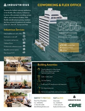 Nestled at the bottom of the Hollywood Hills, Industrious at West Hollywood - 9255 Sunset Blvd is adjacent to our 9229 Sunset Blvd location and provides the perfect day at the office. This location offers coworking, dedicated offices and conference rooms with the ambience of a boutique hotel and panoramic views of the city from the 11th floor. With a thoughtfully-designed lounge, cafe, and phone booths, a day at the office has never felt more luxurious. Located on the famous Sunset Strip next to Beverly Hills, onsite parking is available with bus lines and the 2 Metro Local Line accessible. With Soho House and Boa Steakhouse right across the street, hop around the corner to Sunset Plaza and many more high-end dining, shopping, hotels and attractions that are easily walkable. Discover how the most productive workday meets work-play when visiting Industrious at West Hollywood - 9255 Sunset Blvd.
