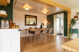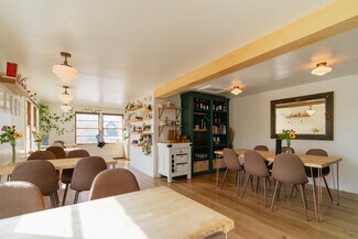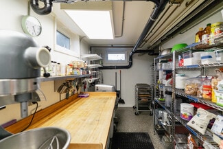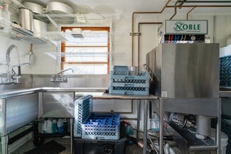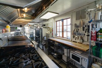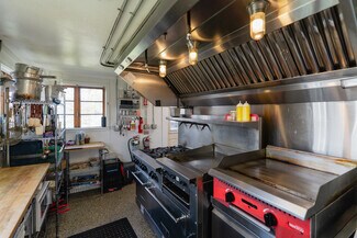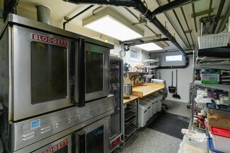 1 8' Ventilation Hood with Fire Suppression System, 1 6-Burner Volcan Range with Ovens and Flat Top, 1 Moveable Gas Flat Top, 2 Blodget Gas Convection Ovens*, 2 Counter-Height Refrigerators, 1 Prep-Cooler Refrigerator, 1 Walk-in Refrigerator, 1 Standing Freezer, 1 Chest Freezer, 1 Microwave, 1 Bain-Marie, 1 Commercial Ice Maker, 1 Two-Group Espresso Machine, 1 Commercial Drip Machine, 1 Espresso Grinder, 1 XL Floor Mixer, 1 Large Countertop Mixer, 1 5' Bakery Butcher Block, 1 Heatlamp Cutting Station, 1 Proofing Box, 1 Low-Temp Dishwasher, Sinks, Shelving, Tables, Chairs, Storage, Cuttlery, Glassware and Serveware. *purchased used in 2022