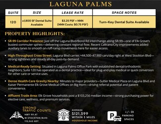 Turn-key ±1,800 SF dental suite available in Laguna Palms Office Park, just off the heavily traveled SR-99 corridor in Elk Grove. Suite 120 is fully built out for dental or medical use, offering a plug-and-play solution for healthcare providers or an easy conversion for wellness and professional services. The property benefits from direct exposure to both Laguna Blvd and SR-99, ensuring visibility to thousands of commuters and strong regional connectivity. With neighboring healthcare tenants, nearby Sutter and Kaiser medical campuses, and a high-income trade area, the location supports steady patient flow and long-term practice growth.