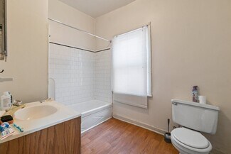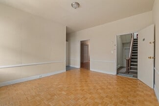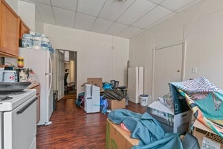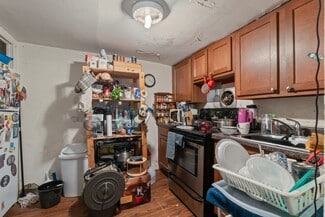 Kitchens are equipped with electric ranges. Four units have laminate countertops and wood cabinets; two have porcelain sinktops with metal cabinets. Bathrooms include steel tubs with ceramic tile or vinyl surrounds, along with and a mix of modern vanities or wall-mounted sinks. Wood windows run throughout the building, with walls finished in plaster or wood paneling. Ceilings are plaster, suspended grid, or Celotex. Apartment 2R has 9? x 9? tile in both the living area and kitchen; all other units feature a mix of laminate, parquet, and vinyl tile flooring.