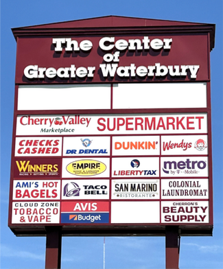 The Center of Greater Waterbury New Local Ownership Prime Commercial Space Available Spaces Range from 912 +/- S/F to 34,517 +/- S/F - Spaces Can Be Combined Perfect for Medical, Flex, Office or Retail Easy Access to I-84 & RT 8 Plaza Tenants: Cherry Valley Grocery, Dunkin Donuts, San Marino, Wendy’s, Taco Bell, Ami’s Bagels, Winner’s Sports, Avis/Budget, Dr. Dental Pad Sites Also Available Lease: $12-$16 PSF + NNN