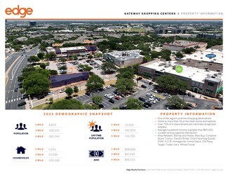 One of the region's premier shopping destinations Home to more than 30 prime retail stores and eateries Over 75% of in place tenants are nationally recognized retailers Average household income is greater than $85,000 Located at busy regional intersection Area Retailers: Barnes and Noble, Best Buy, Container Store, Costco, David's Bridal, Dick's Sporting Goods, DSW, H-E-B, Homegoods, Home Depot, Old Navy, Target, Trader Joe's, Whole Foods