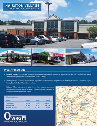 Hairston Village is conveniently located in the Stone Mountain submarket approximately 10 miles east of Atlanta's CBD and 15 miles northeast of Hatsfield-Jackson International Airport. The center is easily accessible from Highway 78, Memorial Drive and East Ponce de Leon Avenue and with frontage on North Hairston Road in Atlanta, Georgia.