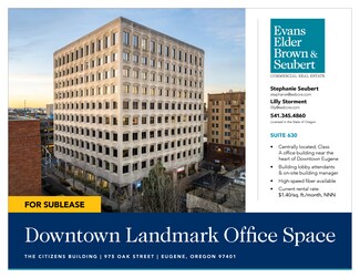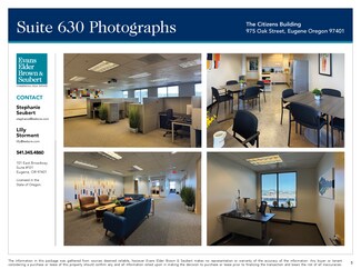 • Centrally located Class A office building near the heart of Downtown Eugene  • Building lobby attendants and on-site building manager provide a high level of customer service to clients and customers  • High speed fiber available SUITE 630: • Approximately 3,776 SF • 6 private offices, each with large windows which provide abundant natural light • Large open work area/conference room • Large lunch room with kitchenette • Shared use of common area restrooms • Current rental rate: $1.40 per square foot per month, triple net • Master Lease expires February 2028