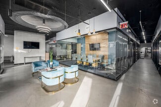 The suite includes 21 windowed-glass offices with abundant natural light, a large conference room for board-level meetings, four private bathrooms, including two ADA-compliant restrooms, and a modern kitchenette. High-tech access control and intercom systems secure the space, while 11-foot ceilings, LED lighting, stone tile finishes, carpet tile flooring, and sleek glass partitions create a contemporary, turnkey environment.
