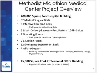 The new 190,000 square-foot full-service acute care hospital is almost complete in Midlothian and is located west of U.S. 287 near the Midlothian ISD multi-purpose stadium. The $175-million facility will be the centerpiece of the 67-acre campus and includes a 45,000 square-foot medical office building. This beautiful office building is fully occupied on the 1st floor and has shell space available for lease on the 2nd floor. Tenant space is available as of July 1, 2020. BROKERS WELCOME.