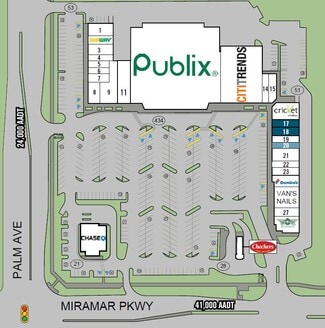 Publix anchored shopping center located at the signalized intersection of Miramar Pkwy (41,000 VPD) and Palm Ave (24,000 VPD) in Miramar, FL. Densely populated area with over 190,000 people within a 3 mile radius along with a strong daytime population. Tenants benefit from significant foot traffic generated by high performing Publix. Notable co-tenants include Citi Trends, Wing Stop, GNC, Chase Bank, and Checkers Drive-In.