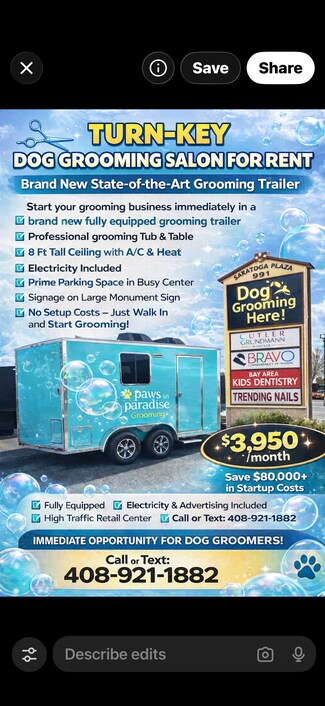 Complete Brand new dog grooming. Class A plus building , Impressive, no homeless (firm approach toward homeless), This space has its own monument sign. Must see. Please call 408-921-1882. Thank you