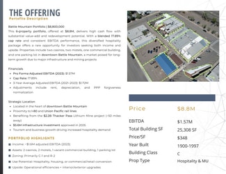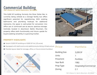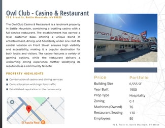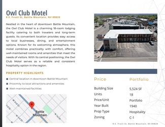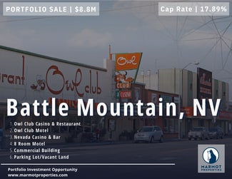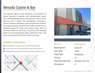 This Battle Mountain Gaming & Hospitality 6-property portfolio, offered at $8.8M, delivers high cash flow with substantial value-add and redevelopment potential. With a blended 17.89% cap rate and consistent EBITDA performance, this diversified hospitality package offers a rare opportunity for investors seeking both income and upside. Properties include two casinos, two motels, one commercial building, and one parking lot in downtown Battle Mountain, a market poised for long-term growth due to major infrastructure and mining projects
