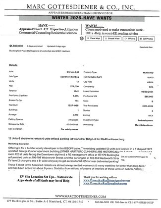 uckingham Place, is located in the only Business Opportunity zoned block in this SODO neighborhood and Downtown and lacks a quality grocery. Spinnaker now has 166 units they are renting a block away and Spinnaker is planning some 300 units 30’ across the street on the vacant lot and PennRose is spending some $52M for rehabbing historically 104 units next to the Bushnell. And as well Spinnaker has another $12M already promised for about another 150 units on Capitol Avenue from CERDACT.net next door's & across the street newer 5 story state built parking garage. I know a niche quality greengrocer on the main floor would be the most appropriate highest use of this 161-165 Buckingham location. Seeking a part owner for the grocery business for partial ownership with thousands of walking apartment dwellers desperately needing a neighborhood Hartford quality greengrocer. If you google or AI how much of a need there is for a greengrocer in Downtown or SODO you will confirm how successful it will be. Not making it up -why don’t you google or AI it and you will get confirmation. Seriously at the “open table” in July in SODO I asked and the consensus was everybody wanted a fresh greengrocer in the neighborhood.. The footprint for 40 units with the ground base area may be too big plus one needs some parking and access from the rear for deliveries, trash so the 30- unit footprint makes more sense and it appears to be around 58 ‘ x 80’ or about 4640sf . SODO& Downtown who would love to have a local grocer. I have the city officials and economic development at the state interested in assisting in financing, probably some grant $ as and my proposals have been before CERDACT.net who think highly of this project with Spinnaker’s vacant 2.25 A lot directly across the street and the Dunkin, convenience store next door. The apartments above the grocery could be veteran, handicapped, affordable and not necessarily fair market unlike the 1000 units being rehabbed and built which will probably be 80% market rate . Summarizing-- I am seeking a partnership sale and to remain in for the 20% that Business Opportunity Zone locations allow for the owner to remain. There are several builders who only want to do the project but best to seek equity partners to put their $ and investment in and not just build and walk away. I am seeking an equity builder-developer grocer partners as this is in a BIZ OPP ZONE- no capital gains to pay upon a sale in 8-10 years -- and my 1927 Zunner building could easily be designated as historical for additional tax credits – See my last attachment of the situation to get an overview.