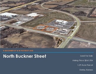 Located near the corner of N Bucker Street and W Patriot Avenue in Derby, Kansas. This property is zoned B-3 General Business District. The property sits near existing national retail including a Kohl’s department store, Dollar Tree, and a Lowe’s home store. N Buckner Street is a heavily traveled corridor making the visibility of this site ideal for retail. A wide variety of uses including office/flex, medical, retail are desired and will complement the surrounding neighbors.