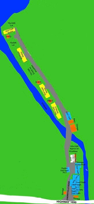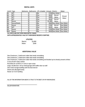 Multiple houses, cabins, mobile homes and lots all with their own UTILITIES (minus the duplexes).