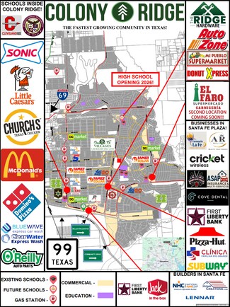 Santa Fe, part of Colony Ridge Communities, spans 34,000± acres and is continuously expanding, boasting ~13,900+ rooftops and a thriving community of 60,000+ residents, set to reach 250,000 upon completion. The developer sells over 100+ residential lots weekly, achieving an average of 100+ new rooftops/families moving here each month. Our community proudly hosts 6 schools, with the 7th slated to open 2026, contributing to the rapid growth of Cleveland ISD, now the fastest-growing ISD in TX. Positioned with 3 direct access points on 99 between 59 and I-10, our community offers convenience.