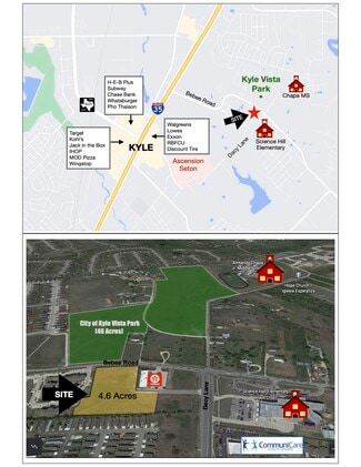 The site is 1/2 mi. east of I-35, 1 mi. north of Seton Medical and retail center, and approximately 2 mi. from new Austin Community College campus. Property is across the street from Science Hill Elementary and the Communicare Health Center. It is 1/4 mi. south from Chapa Middle School and across the street from the planned 30 acres City of Kyle park, and next to 306 apartments which adjoins the 600 home Amberwood Subdivision. The property is 1/4 mi. west of the 500 home Kensington Trails Subdivision. Meadows at Kyle, a new SF subdivision, is being developed across BeBee Rd. and the new Crosswinds Subdivision (1400 sf homes) is being developed diagonally across the intersection of BeBee Rd. and Dacy Ln. Restaurants within 1.5 mi. of the Property include: Whataburger, Chick-fil-a, Pho 99, Casa Garcia, Applebee's Grill and Bar, Koy Chinese & Sushi, Ilario's Italian Cuisine, Pho Thai Son and MOD Pizza.