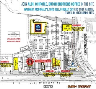 Avant Real Estate is proud to present this new development project in the heart of Apple Valley. This 8-acre retail shopping center will have plenty of parking and great visibility off Happy Trails Hwy. Plans are modifiable if need be. Located nearby many big box retailers such as Walmart, Target, 99 Cent Only Stores, and many more. Located on Highway 18, this new center will attract plenty of consumers. National brand tenants joining the center such as Aldi, Chipotle and Dutch Brothers Coffee. Another National Burger Tenant is about to join the plaza as well.
