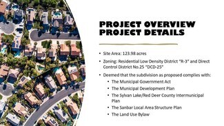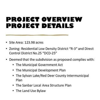 * The Zoning is for Residential Low-density District “R-3” and Direct Control District No.25 “DCD-25” and deemed that the subdivision as proposed complies with The Municipal Government Act, The Municipal Development Plan, The Sylvan Lake/Red Deer County Intermunicipal Plan, The Sanbar Local Area Structure Plan and The Land Use Bylaw.