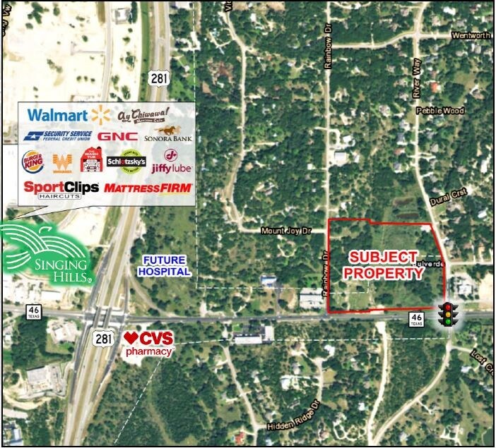 This is a platted parcel that presents an excellent opportunity for a pharmacy, day care, restaurant, assisted living facility, and service retail users. This property is also at a four-way signalized intersection in a booming area with excellent demographics. In addition, the City of Bulverde has imminent plans to commence the South/East System Expansion for their Regional Wastewater System. The sewer expansion project will provide the subject property with enough capacity for a number of uses, including commercial and/or multifamily. The property is located on the north side of Highway 46 between Rainbow Drive and River Way, less than a 1/2 mile east of Highway 281 in Comal County, TX.